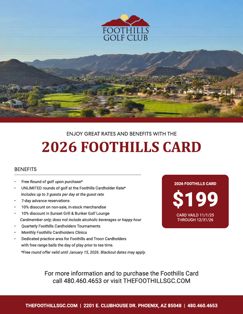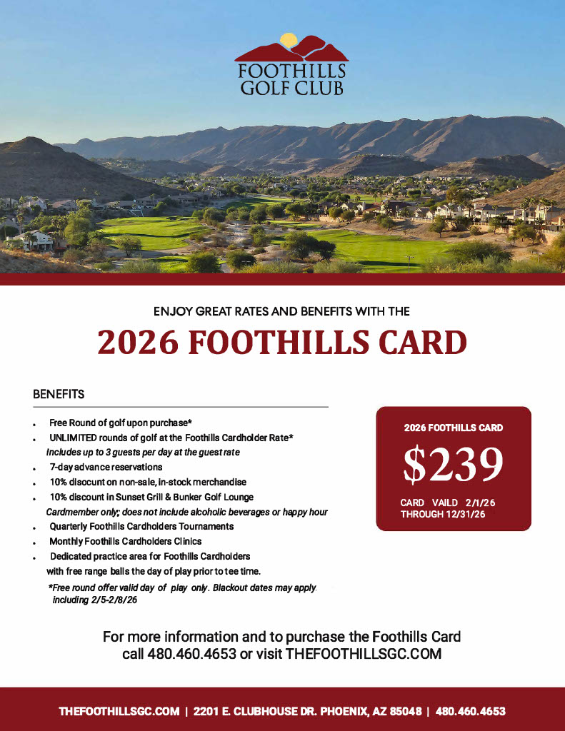 The Foothills Golf Club stretches to almost 7,000 yards with lush rolling fairways, blue lakes, and 65 bunkers set against rough rocky desert terrain. With four sets of tees, The Foothills Golf Club has appeal for golfers of all skill levels and has earned a four-star ranking from Golf Digest, along with being listed as one of Phoenix’s top golf courses.